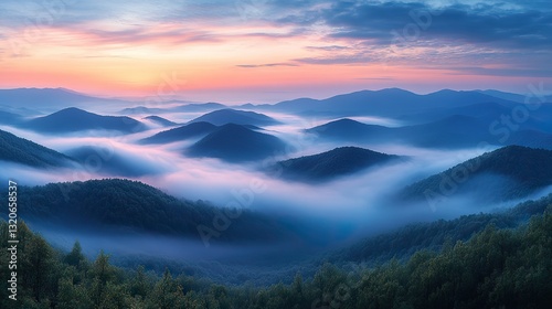 Fog blankets mountain peaks, creating a tranquil dawn atmosphere where nature and sky harmoniously blend in a serene, breathtaking landscape.