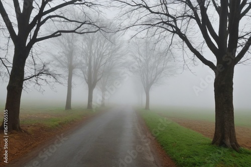 fog, mist, road, country, tree, tree, bare, landscape, nature, weather, autumn, fall, winter, mysterious, moody, atmosphere, scenic, travel, drive, journey, path, way, empty, deserted, quiet, peaceful, calm, serene, solitude, loneliness, cold, damp, grey, white, hazy, misty, outdoors, rural, countryside, field, grass, green, season, morning, day, light, shadow, perspective