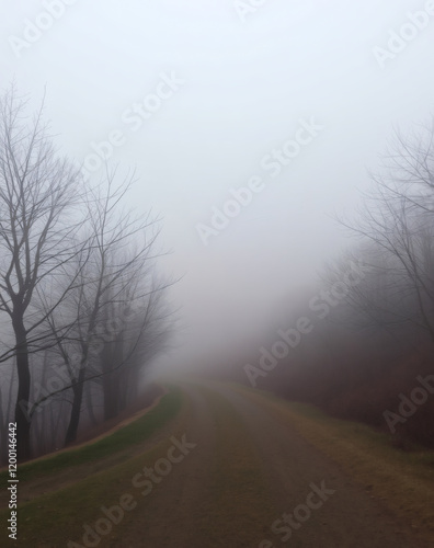 Fog envelops a winding path through bare trees on a quiet morning in the countryside