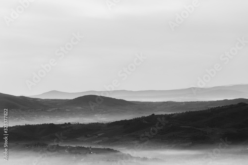Fog filling a valley in Umbria (Italy), with layers of mountains and hills