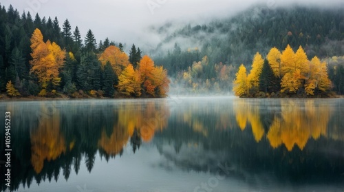 Fog in nature. A misty forest in autumn with a mix of evergreen and yellow-orange deciduous trees