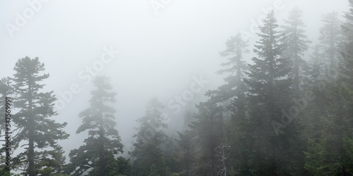 Fog in the forest. Panoramic misty view from Larch Mountain in Oregon.