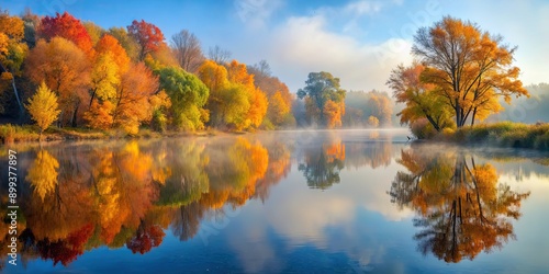 Foggy autumn morning on the river with colorful trees reflected in the water , fog, mist, river, autumn, fall, trees