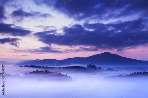 Foggy autumn or summer landscape. Misty foggy morning with sunrise in a valley of Bohemian Switzerland park. Detail of forest, landscape of Czech Republic, beautiful national park Bohemian Switzerland