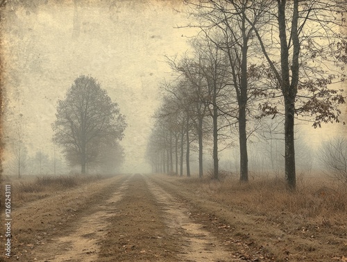 Foggy autumnal country road, trees line the way, tranquil scene