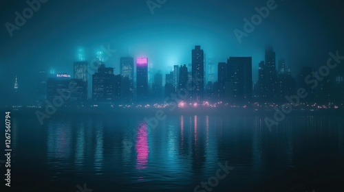 Foggy city skyline at night, reflected in water; urban scene, futuristic feel; ideal for sci-fi, fantasy or city backgrounds