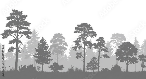 Foggy Forest Landscape with Pine Trees in Gray Tones