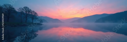 Foggy lake on a serene evening with soft focus, lake, twilight