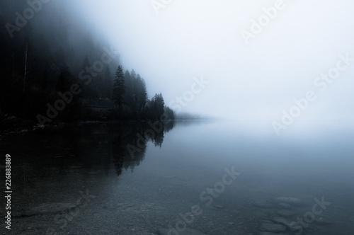 Foggy morning on the border of calm lake in Austrian Alps