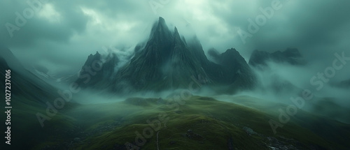 Foggy mountain landscape with dark clouds looming overhead, creating a sense of tension and drama. The mist rolls down the mountainside, adding mystery and cinematic depth.