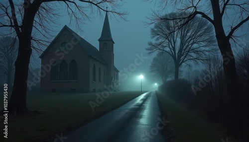 Foggy street leading to a dark abandoned church at night with long shadows creeping along the walls and the eerie hum of the wind.
