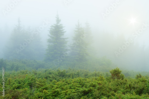 fog, tree, green, forest, bush, spruce, landscape, nature, summer, season, moisture, coniferous, dampness, mist, haze, background, foggy, misty, hazy, cloudy, day, environment, mysterious, nobody, scenery, scenic, weather, wildlife, wood