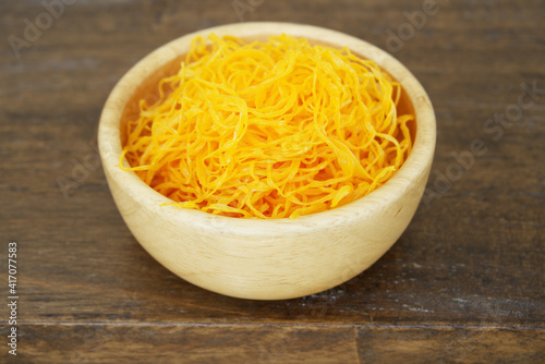 Foi Thong (Golden Egg Yolk Threads) In a wooden cup close up