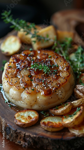 Foie gras with white beans and potato chips served on a rustic wooden board, complemented by a drizzle of truffle oil and a sprig of fresh herbs