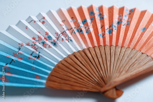fan, paper, folding, japanese, traditional, decorative, floral, cherry, blossom, pattern, pastel, orange, coral, light, blue, light blue, wooden, bamboo, handle, craftsmanship, asian, oriental, art, design, closeup, detail, texture, handcraft, portable, cooling, summer, gift, display, object, accessory, beauty, ornamental, pink, peach, vibrant, colours, pretty, elegant, unique, simple, hand-held, vintage