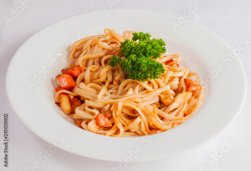 pasta, food, spaghetti, meal, plate, dinner, dish, sauce, italian, cookery, tomatoes, noodle, shrimp, lunch, white, delicious, noodle, salad, healthy, seafood, epicure, tasty, cheese, basil, vegetable