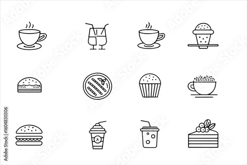 Food and Drink Icon Set with Coffee Tea Dessert and Beverage Illustrations