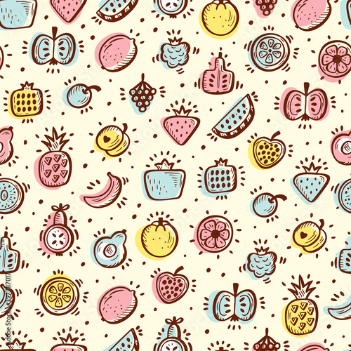 Food background. Doodle Fruits and Berries Seamless pattern. Vector illustration