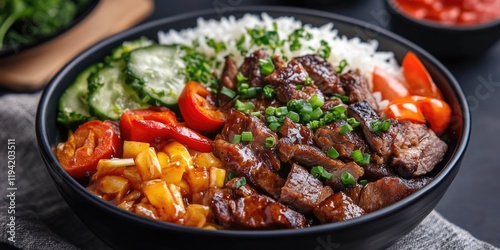 food, bowl, rice, grain, meat, protein, vegetable, healthy, nourishment, meal, lunch, dinner, cookery, culinary, dish, savoury, main, course, appetence, hunger, satiety, comfort, nourishment, sustenance, snack, breakfast