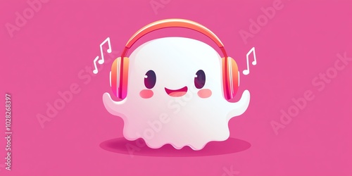 ghost, character, music, cute, wear, earphones, enjoy, vibrant, pink, background, horn, artsy, festive, cheerful, cartoon, vector, colours, pumpkin, nightlife, candy, attire, design, joy, costume, spirit, nubes, love, illustration, valentine, symbol, icon, day, card, art, decoration, toy, baby, holiday, shape