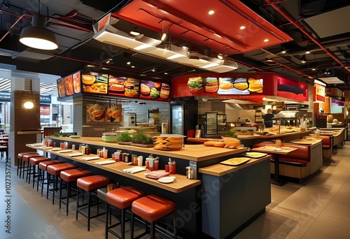 food, court, stall, seating, area, pizza, sushi, burger, salad, dessert, beverage, condiment, napkin, table, chair, take-out, menu, display, kitchen, decor, lighting, fixture, option, dining, supply, signage, vibrant, diverse, arrangement, tool