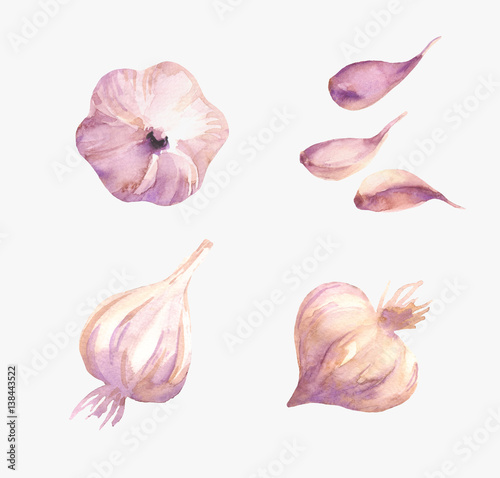 Food design set with garlic watercolor. Vegetable background in hand drawn style. Isolated on white background.