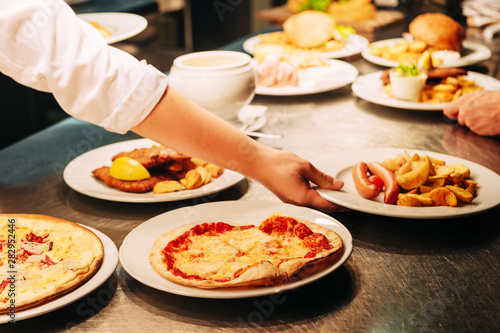 background, chef, cook, cooking, cookery, culinary, delicious, hamburger, diversity, food, pizza, kitchen, meal, menu, stove, order, potato, plate, preparation, profession, professional, eatery, table, tasty, work, kitchen utensile, commercial, industry, job, buffet, choice, clean, salad, staff, preparing, service, cafeteria, garnish, dinner, meat, hotel, receipe, hand, board, fried, interior, waiter, white