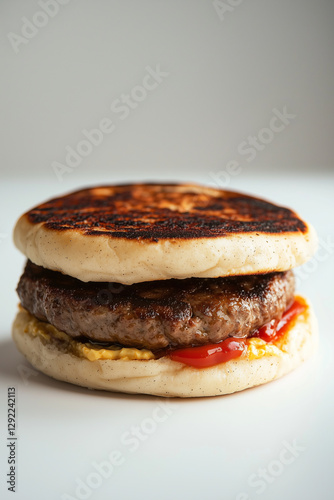Food photography, front view, a minimalist burger made of round, soft naan bread, golden in color, authentic burnt spots and a slightly puffy texture