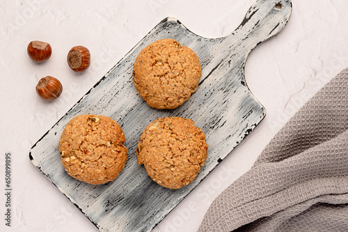 Food photography of oat biscuit; oatmeal; cookie;nut; hazelnut, pastry, dessert; wooden board