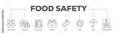 Food safety icons process flow web banner illustration of consumer, hazards, inspection, health, eat, virus, safe and certification icon live stroke and easy to edit