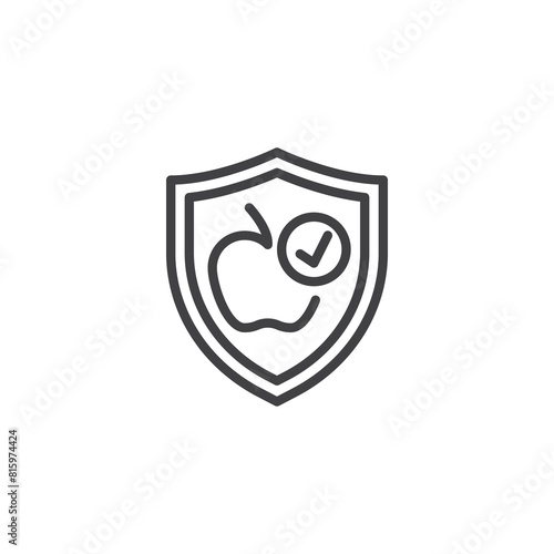 food, safety, apple, shield, check, mark, icon, line, outline, linear, vector, logotype, pictogram, symbol, signs, clip art, design, illustration, thin, editable, graphic, simple, pixel, honed, hollow, fruit, organic, protection, clean, tick, approve, quality, guarantee
