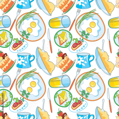 food, beverage, seamless, pattern, breakfast, scrambled eggs, onion, parsley, sandwich, cheese, sausage, cake, cream, strawberry, chocolate, cereal, juice, orange juice, cup, plate, saucer, fork, knife, vector, set, isolated