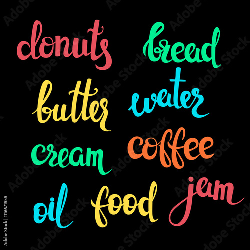 Food theme lettering. Vector illustration. Handwritten words, original design. Calligraphic icons. Bread, coffee, butter, oil, water, cream, jam.