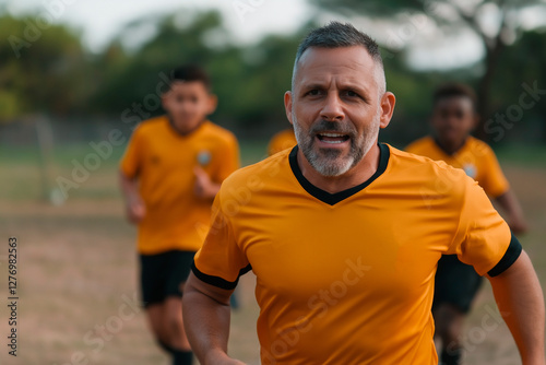 Football mentor organizing strategic drills, developing young athletes' awareness, speed, and ball control, fostering discipline and teamwork on the practice field.