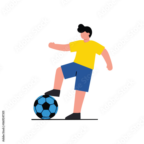 football, soccer, player, athlete, ball, sport, game, illustration, vector, character, person, standing, controlling, foot, training, exercise, fitness, youth, children, boy, man, male, activity, leisure, skill, graphic, art, cartoon, flat, minimalist, simple, colourful, bright, vibrant, dynamic, cut-out, modern, health, healthy, lifestyle, playful, active, fun, hobby, movement, sportsman, talent