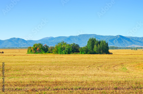 view, landscape, scenery, environment, hill, field, foothill, agriculture, farmland, country, countryside, rural, harvest, siberia, altai, russia, sky, cloudless, blue, blue skies, gold, yellow, nature, tree, curve