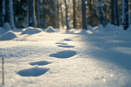 Footprints leading through a snowy forest in winter