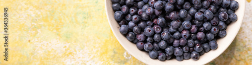 Forest berries blueberry,bramble in a ceramic bowl.Top view.Space for text.Blueberry antioxidant. Concept for healthy eating and nutrition.Border design.Summer healthy food. Banner.