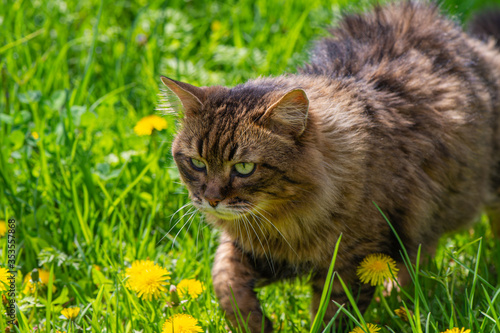 Forest cat walks through a meadow covered with green grass and flowering dandelions on a sunny day.