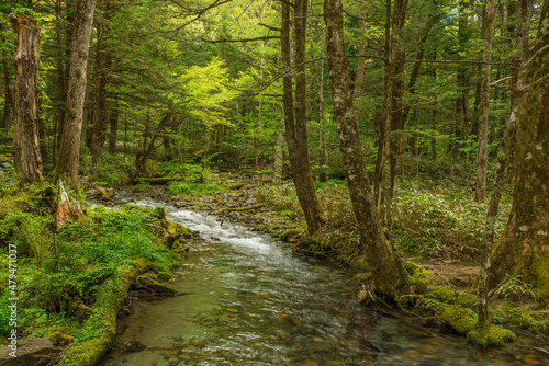 Forest creek, lush green woodland in Kamikochi, Nagano, Japan