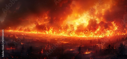 Forest fire disaster; raging inferno consumes landscape. Climate change impact
