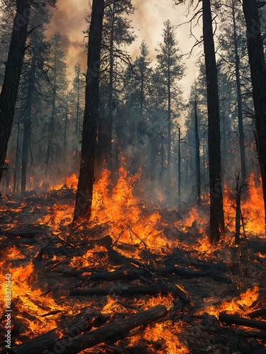 wildfire, forest fire, global warming, flames, inferno, fire, smoke, destruction, nature, environment, disaster, climate change, heat, danger, emergency, natural disaster, landscape, wilderness, ecology, forestry, firefighting, rescue, blaze, scorching, charred, devastation, catastrophy, loss, damage, environmental impact, orange, red, yellow, black, apocalyptic, harrowing, intense, dramatic, powerful