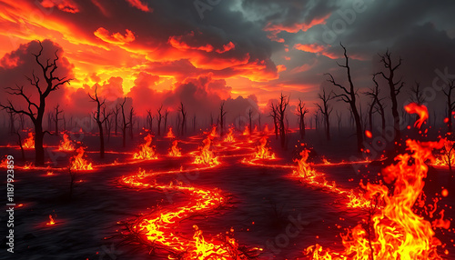 wildfire, forest fire, fire, burning, flames, smoke, mountain, tree, landscape, nature, devastation, destruction, environment, disaster, ecology, danger, dramatic, twilight, sunset, sunrise, orange, red, closeup, scenic, mountain chain, winter, snow, climate change, global warming, destructive, illustration, digital artwork, realistic, conservation, loss, tragedy, natural disaster, fir-wood, conifer, autumn, firefighting, climate