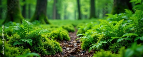 Forest floor covered in a thick layer of moss and ferns, forest carpet, natural