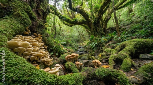 forest, nature, jungle, tree, moss, stream, mushroom, fungal, green, plant, vegetation, environment, flora, photo, daylight, forest floor, landscape, wild, brown, beige, detail, root, rock, water, lush, tropical, scenic, photographic, background, wet, natural, scenic view, tranquil, natural light, closeup, hiking, environmental, fungal, biodiversity