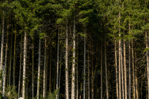 Forest landscape background. Pine forest. Nature Environment. Countryside forest. Nature background. Forest hiking.