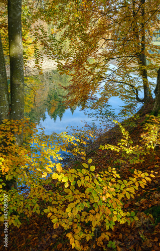 Forest meadow on shore of picturesque lake. Vilshany water reservoir on the Tereblya river, Transcarpathia, Ukraine. Beautiful autumn day in Carpathian Mountains.