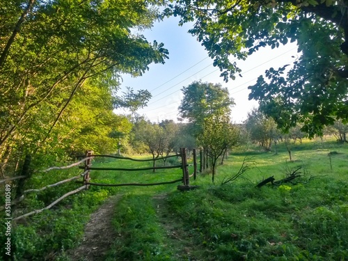 fence, landscape, nature, grass, tree, green, countryside, field, rural, tree, farm, sky, summer, road, forest, meadow, country, spring, wood, path, gate, view, park, blue, trail, outdoors, sunlight, sun, sunshine, environment, way, shine, leaf, lane, bright, light, lush, branch, sunny, alley