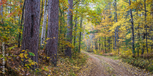 Forest service road through a Northern Wisconsin woodland in peak autumn colors. Vilas County, WI.