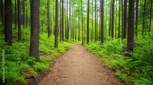 Forest Trail Adventure, a vibrant summer hike through lush greenery, offering an open space for reflection and connection with nature amidst towering trees and serene landscapes